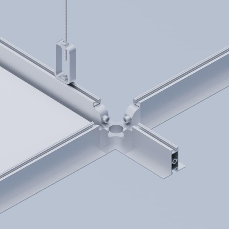 The framework comprises primary runners with precise notches for accurate placement and connection of fitted structural tees using straightforward four-screw connectors. Designed to accommodate power modules, lighting fixtures, cable trays, partitions, and other attachments.